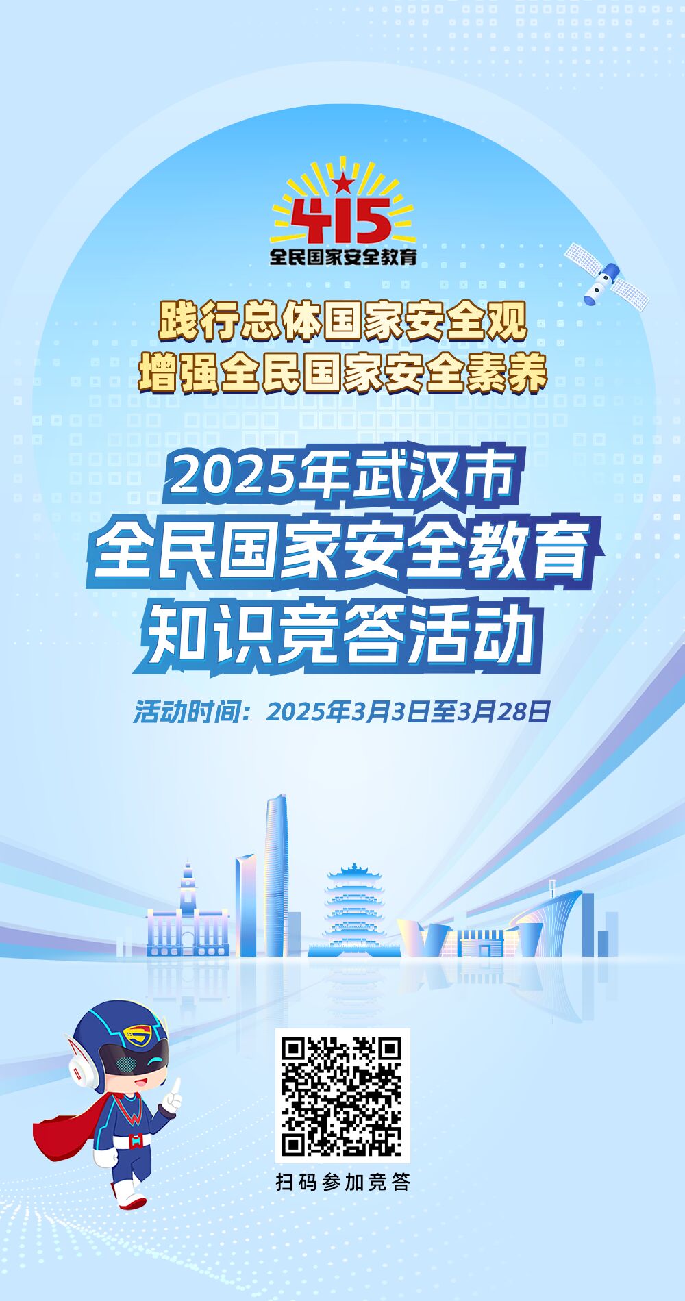 2025年是《国家安全法》颁布十周年,4月15日将迎来第十个全民国家安全教育日。为深入学习贯彻总体国家安全观,增强全民国家安全意识和素养,2025年武汉市全民国家安全教育知识竞答活动将于3月3日正式拉开帷幕。