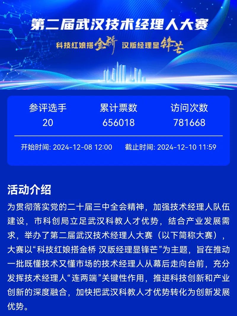 本次大赛以“科技红娘搭金桥,汉版经理显锋芒”为主题,由武汉市科技创新局主办,武汉市科技成果转化促进中心、武汉武创通科技服务有限公司承办。