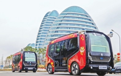 在武汉经开区运营的东风悦享无人驾驶小巴。