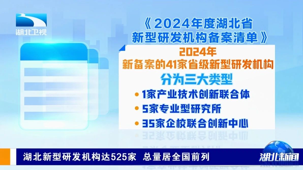 近日,湖北省科技厅公布了2024年度湖北省新型研发机构备案清单,41家单位通过资格审查、公示等程序,成为省级新型研发机构。至此,全省新型研发机构已达到525家,数量排名位居全国前列。