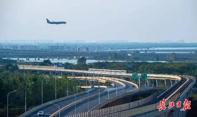 天河国际机场,一架客机从武孝高速公路和地铁二号线上空飞过。记者郭良朔 摄