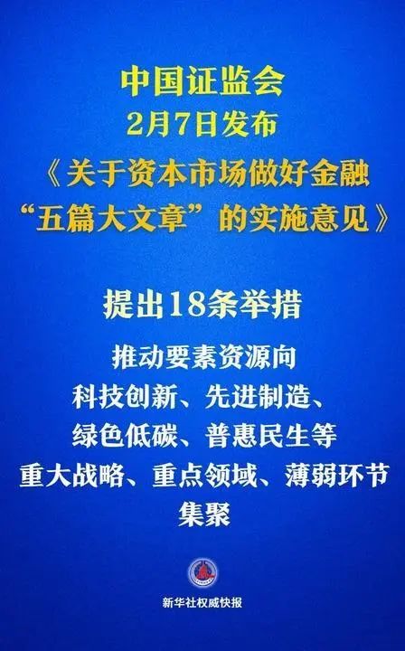 中国证监会2月7日发布《关于资本市场做好金融“五篇大文章”的实施意见》。这份改革方案推动要素资源向科技创新、先进制造、绿色低碳、普惠民生等重大战略、重点领域、薄弱环节集聚。