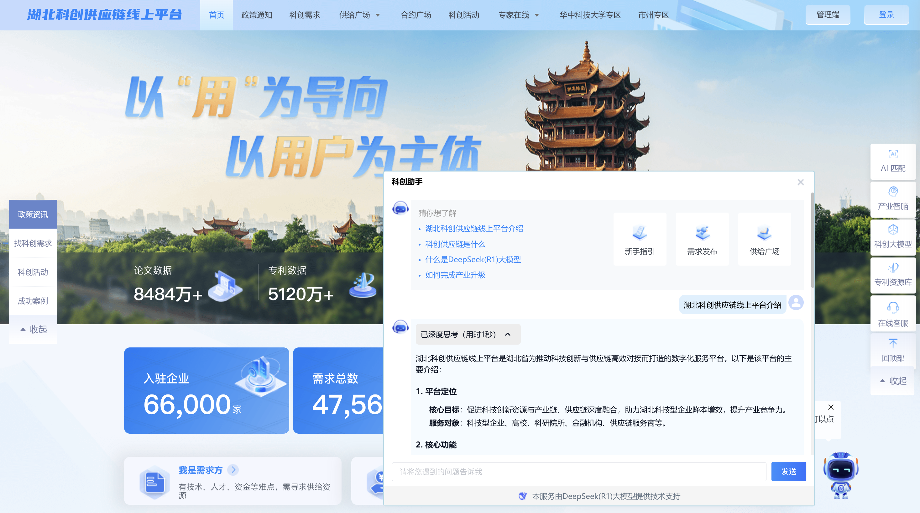 通过湖北科创供应链平台首页科创助手,用户可体验更智能化、个性化的服务,交互式问答效率与用户体验显著提升。