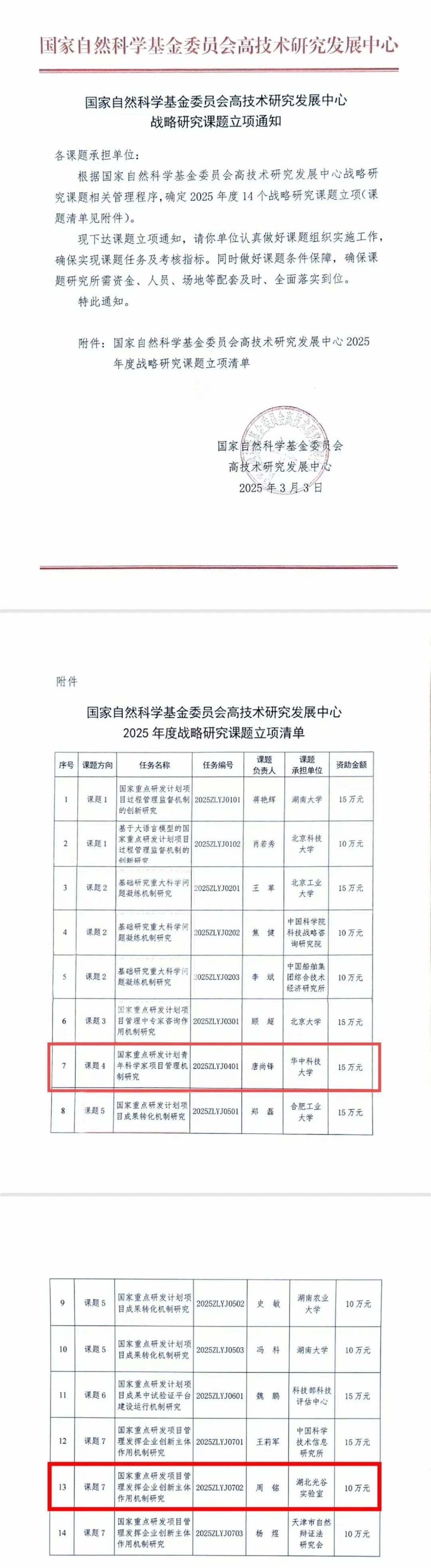 近日,《国家自然科学基金委员会高技术研究发展中心战略研究课题立项通知》发布,确定2025年度14个战略研究课题立项,湖北光谷实验室、华中科技大学获批战略研究课题。