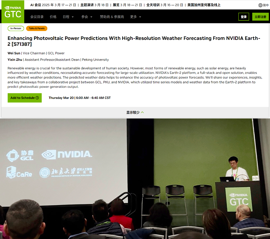 3月20日,北京时间早上6点,我院为协鑫(集团)控股有限公司开发项目“基于Earth-2平台的高精度光伏预测系统”在GTC大会正式亮相。