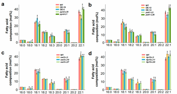 图2 候选基因在油菜中功能鉴定基于GWAS、TWAS、POCKET算法及种子发育动态表达谱,预测出6个可能影响油菜脂肪酸组成的基因作为候选基因。经实验验证,其中四个基因(BnaA09.PYRD、BnaA08.PSK1、BnaA08.SWI3和BnaC02.LTP15)正向调控油酸含量并负向调控芥酸含量(图2)。
