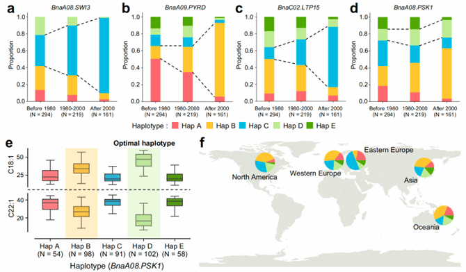图3 候选基因在油菜育种潜力中的应用此外,研究发现四个功能基因的最优单倍型在育种进程中的动态选择存在差异。其中BnaA09.PYRD、BnaA08.SWI3和BnaC02.LTP15这3个基因的最优单倍型已经被主动用于脂肪酸定向改良,而BnaA08.PSK1最优单倍型在历史育种中未出现显著变化,其育种潜力尚未释放,可能成为未来突破高油酸低芥酸品种的新靶点(图3)。