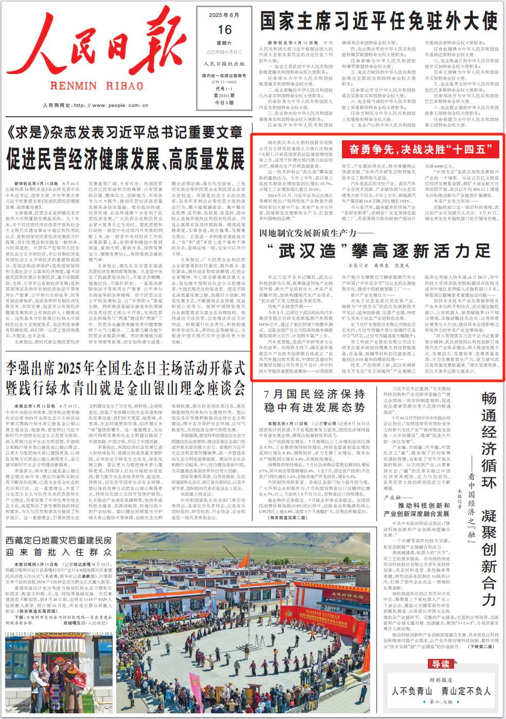 8月16日,人民日报1版刊发报道《因地制宜发展新质生产力——“武汉造”攀高逐新活力足》,全文如下:
