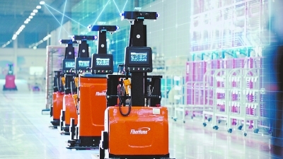 烽火通信数字工厂内,AGV无人车来回穿梭。