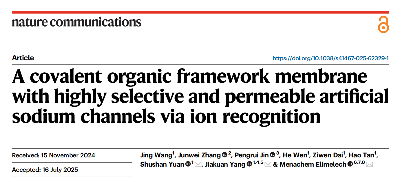 近日,《自然·通讯》(Nature Communications)在线发表了一项关于高性能离子分离膜材料的突破性研究成果,题为“一种通过离子识别具有高选择性和渗透性人工钠通道的共价有机框架膜(A covalent organic framework membrane with highly selective and permeable artificial sodium channels via ion recognition)”。该研究由华中科技大学与多所国际顶尖科研机构深度合作完成。