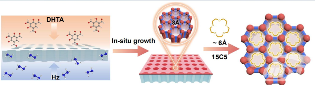 通过在双通道阳极氧化铝(AAO)支持体上进行单体的原位生长,随后进行冠醚的后修饰,形成DHTA-Hz-15C5膜。采用2,4-二羟基苯-1,3,5-三甲醛(DHTA)和水合肼(Hz)分别在有机相和水相中进行聚合反应,形成DHTA-Hz膜。接着引入15-冠-5醚(15C5),其较小尺寸(6Å)与一维纳米通道(8.4Å)相结合,确保稳定结合且不改变表面特性。这种复合型结构保留了COF一维通道快速传输的优势,离子特异性识别的分子引入也可实现目标离子的选择性分离。研究为开发高效单离子传输的COF材料提供了新思路,并推动冠醚在纳米受限环境中离子选择性的应用。