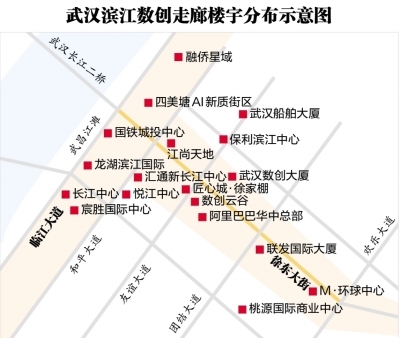 目前,武汉滨江数创走廊沿徐东大街、临江大道两侧约5.6平方公里范围内形成T轴。以武汉数创大厦、阿里中心、数创云谷、四美塘AI新质街区“三楼一园”为代表的滨江数创走廊一期已集聚成势。以国铁城投中心、武汉船舶大厦等楼宇为代表的滨江数创走廊二期建设正加快推进中。