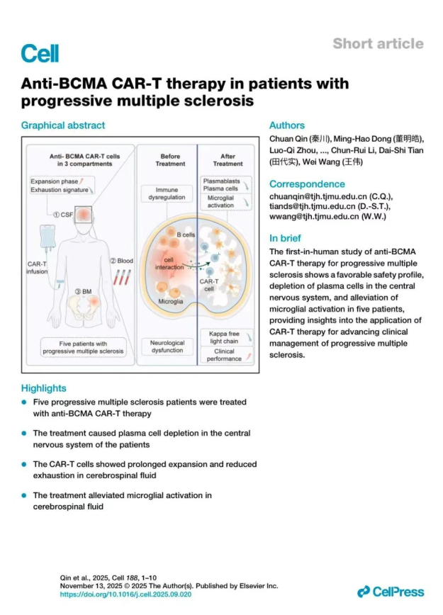 国际顶尖学术期刊《细胞》(Cell)发表论文同济医院王伟团队全球首创CAR-T细胞疗法治疗进展型多发性硬化病