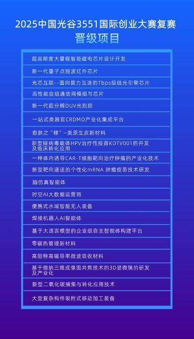 2025中国光谷3551国际创业大赛复赛10月14日-17日连续开赛。全球115个晋级项目,分为光电子信息、生命大健康、人工智能、新材料与高端装备制造四大领域同台竞技,最终决出前20强及60个优秀奖项目。