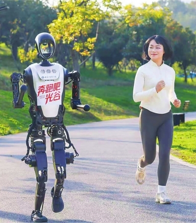 人形机器人沿着光谷中央生态大走廊步道奔跑。张希祉 摄