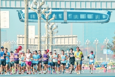 “光谷光子号” 空轨列车与奔跑的选手同框。
