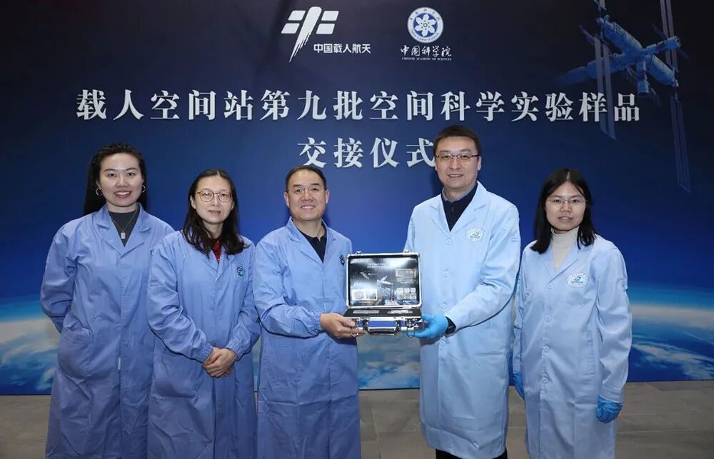 华中科技大学教授周诚(右二)接收从太空返回的“月壤砖”。新华网发(华中科技大学供图)