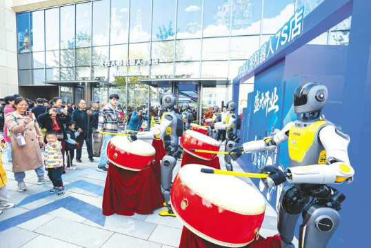 11月11日,全国首家人形机器人7S店在光谷开业,机器人擂响欢庆鼓。 (湖北日报全媒记者 魏铼 摄)