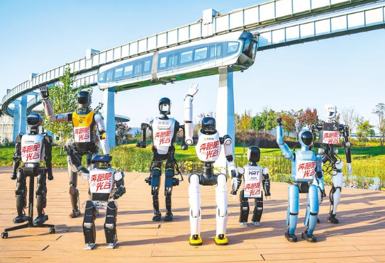 11月4日,光谷中央生态大走廊,8台来自5家光谷企业和高校的人形机器人齐聚一堂,为光谷马拉松助威。(湖北日报全媒记者 魏铼 摄)