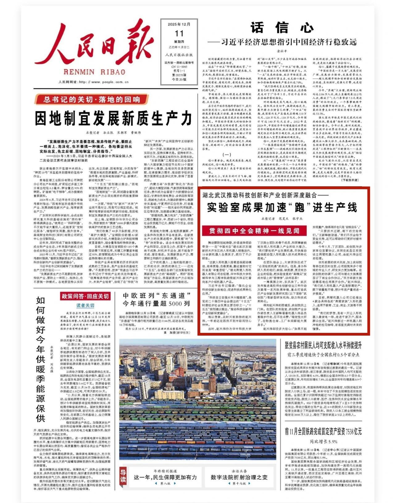 近日,人形机器人“荆楚”成功进军汽车、文旅、教育等多个行业,表现不断刷新认知,订单源源不断。人民日报12月11日在头版“贯彻四中全会精神一线见闻”专栏推出《湖北武汉推动科技创新和产业创新深度融合——实验室成果加速“跑”进生产线》,解码湖北武汉如何发挥政策支持、人才资源等优势,推动技术成果转化落地,全力抢占人形机器人技术和产业制高点。