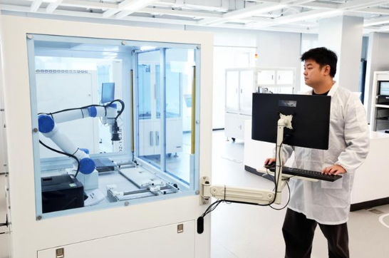 鸿蒙生态(武汉)创新中心星汉实验室内,工作人员通过六轴机械臂模拟用户的真实操作,进行人机交互测试。