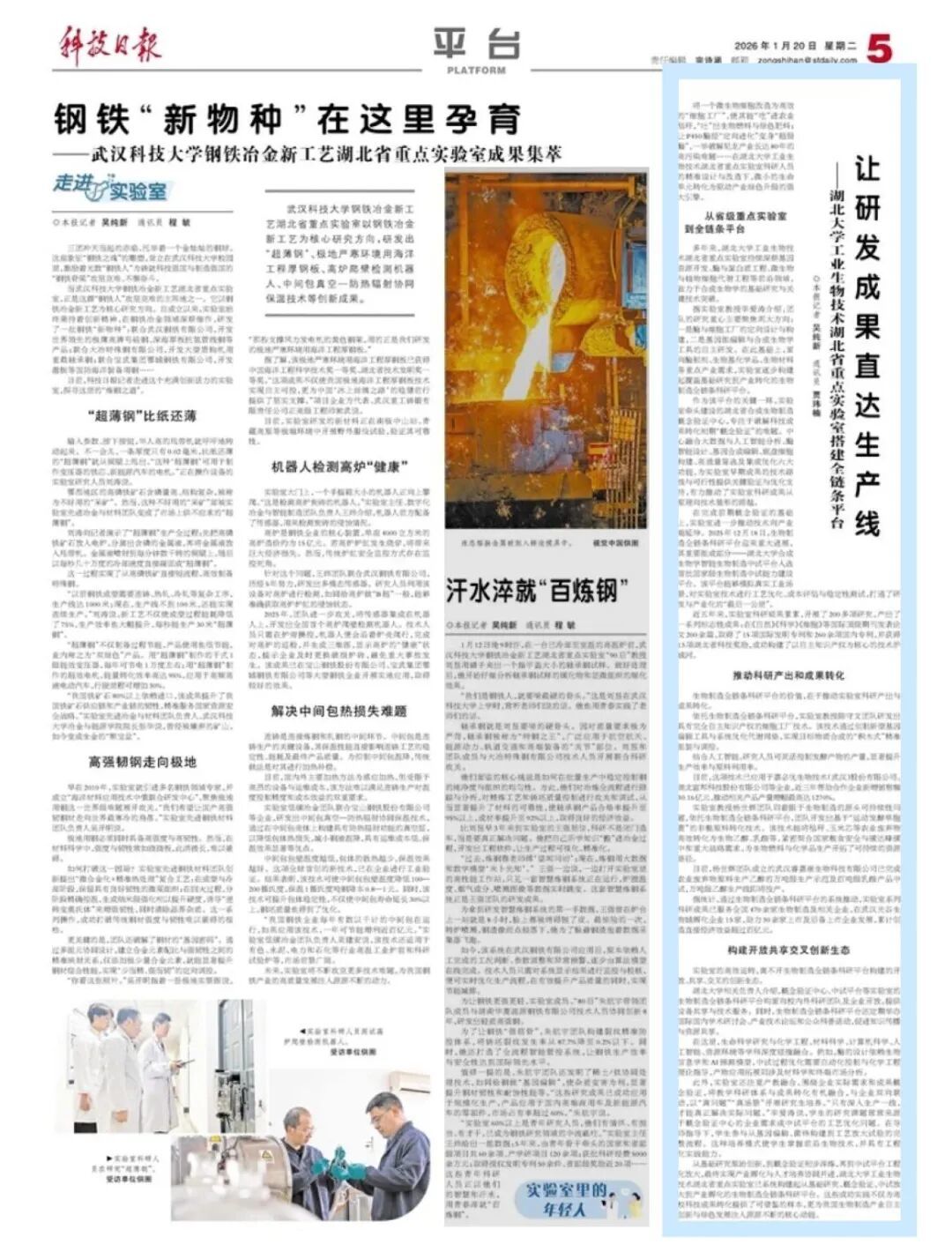 近日,《科技日报》05版刊发报道《让研发成果直达生产线——湖北大学工业生物技术湖北省重点实验室搭建全链条平台》,报道湖北大学工业生物技术湖北省重点实验室构建从基础研究、概念验证、中试放大到产业孵化的生物制造全链条科研平台,为我国生物制造产业自主创新与绿色发展注入源源不断的核心动能。
