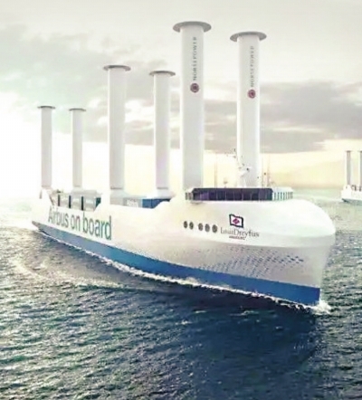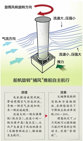 6个旋筒风帆就像一个可旋转的巨型风筝,能随时变换角度以捕捉最强劲的风力。船在海上航行时,风从侧面吹向旋筒风帆,通过马格努斯效应可改变方向吹向船尾,产生的推力就能驱动船自主航行。理想状况下,6只风帆可以提供船只航行所需的全部动力,实现“零排放”。