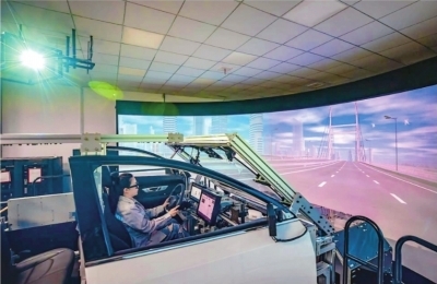 武汉市智能网联汽车产业创新联合实验室仿真测试实验室内工程师正在进行测试。