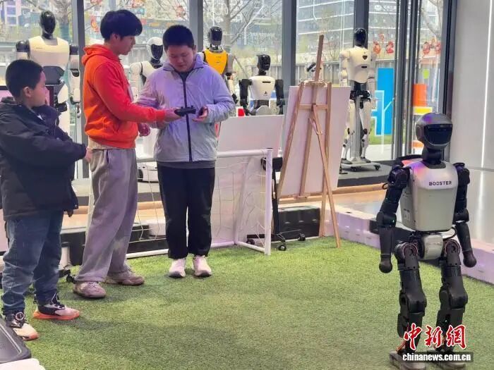 2月27日,消费者在武汉光谷人形机器人7S店体验机器人踢足球。中新社记者 武一力 摄