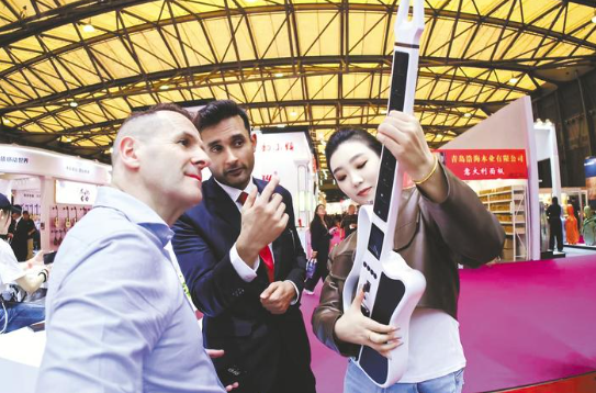 销售人员向外国客户介绍智能吉他K1。(受访者供图)