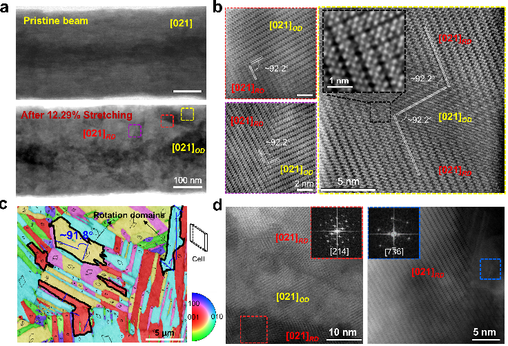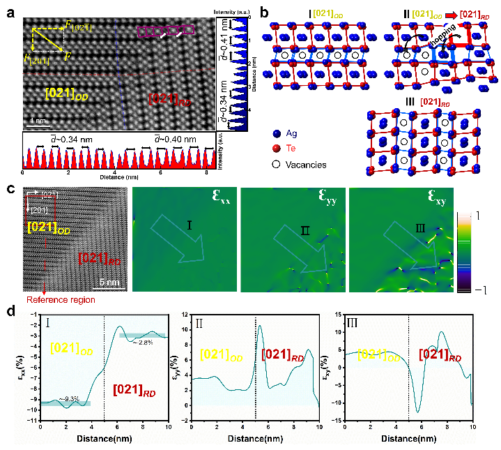 在此背景下,该研究聚焦于碲化银(Ag2Te)这一近室温高性能热电材料。通过原位扫描/透射电子显微镜(S/TEM)技术,研究团队直接观察到了Ag2Te中一种全新的变形机制——“离子跳跃介导的畴转动”(ionic-hop-mediated domain rotation)。研究发现,在应力作用下,银离子通过跳跃至相邻空位,能够有效稳定变形后的碲(Te)亚点阵,并促使晶格发生约92.2°的协调转动,从而释放塑性应变。这种机制使Ag2Te在保持长程有序晶体结构的同时,展现出优异的室温塑性(块体拉伸应变超过12%)。