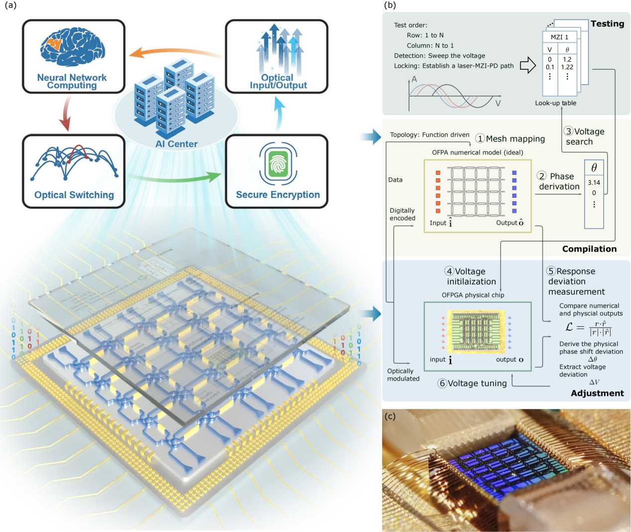 LightIN的核心是一枚采用SOI工艺制造的硅基集成光子芯片,采用4×4方形循环网格拓扑,集成40个可编程单元(共计160余个器件)。研究团队自研TCA智能配置框架,在无需片内监测光电探测器的条件下,实现了芯片功能的高效配置与可靠调节。