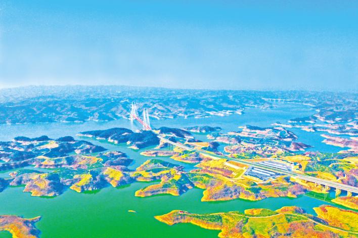 航拍从秀丽山水间穿过的十淅高速丹江口水库特大桥。 (湖北日报全媒记者 田悦 摄)