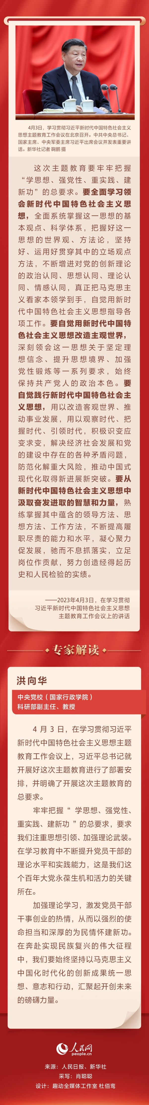 4月3日,学习贯彻习近平新时代中国特色社会主义思想主题教育工作会议在北京召开。中共中央总书记、国家主席、中央军委主席习近平出席会议并发表重要讲话。习近平强调,这次主题教育要牢牢把握“学思想、强党性、重实践、建新功”的总要求。人民网邀请专家进行解读。
